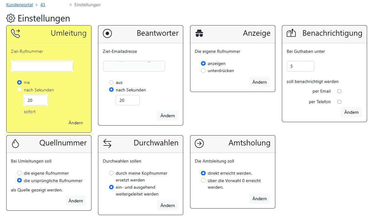 Nach Klick auf Einstellungen kann man auf der Folgeseite entweder eine Rufumleitung anlegen oder auch andere Optionen auswählen.