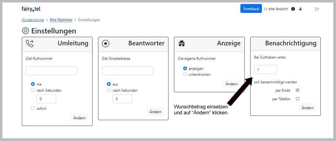 Benachrichtigung bei niedrigem Guthaben Auf dieser Seite geht es weiter:Da die Aufladung des Guthabens ca. 3 - 4 Werktage benötigt, setzt man hier einen ausreichenden Betrag ein. Veröffentlicht 18.02.2026 08:04