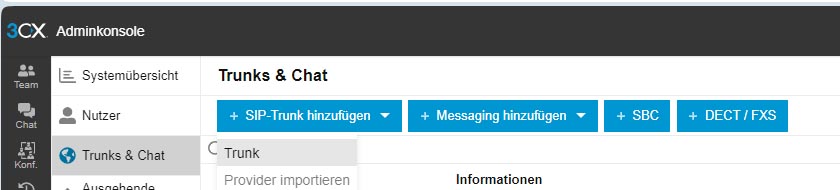 Klicken Sie auf "Admin" > "Trunks & Chat" > "3CX SBC hinzufügen".